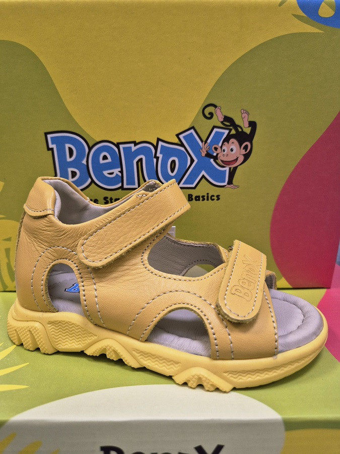 Dupla tépőzáras gyerekszandál sárga színben, sárga talpszéllel. Természetes mozgást biztosít a lábaknak. A szandál talpa rugalmas, csúszásmentes.  A lábaknak megfelelő biztonságot nyújt, rendkívül kényelmes, valódi bőrből készült, jól fogja a bokát, erős hátsó kéreggel rendelkezik. Minden Benox szandál anatómiailag megfelelő kialakítású. Szélesebb lábfejre ajánlott.