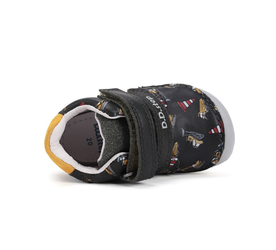 Barefoot ( mezítlábas) zárt gyerekcipő, amely nagyszerűen védi a lábakat. Olajzöld színben, munkagépes mintával. Ezek a D.D.Step gyerekcipő talpak hozzájárulnak, hogy a kicsik meg tudják tapasztalni  a mezítlábas járás minden élményét.  Valódi bőrből készült vízlepergető cipellő, amely biztosítja a lábikók természetes mozgását, így a járással együtt az izom is megfelelő módon tud fejlődni.