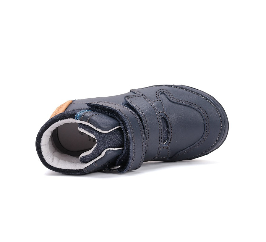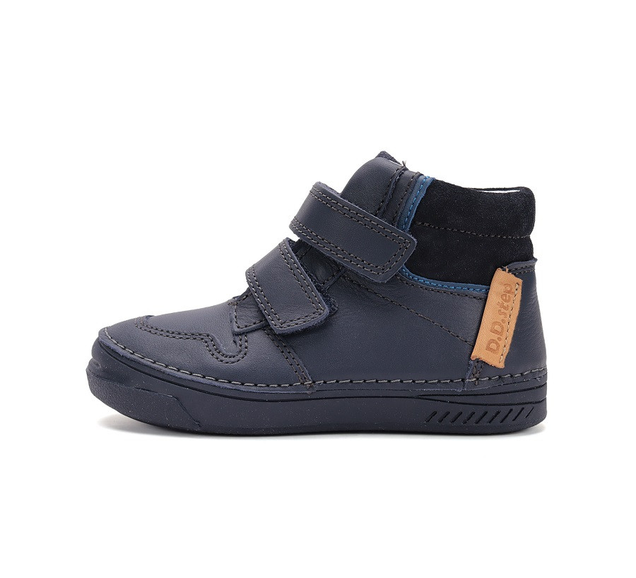 Magasszárú sötétkék színű, mintás, valódi bőrből készült zárt gyerekcipő. Kialakításával tökéletesen biztosítja a lábak természetes mozgását. Kényelmes és divatos modell a D.D.Step átmeneti gyerekcipő kollekciójából.