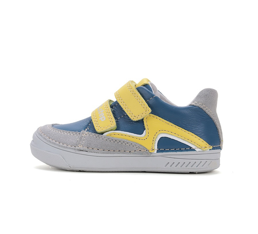 Átmeneti gyerekcipő kék-sárga színben, gumis orral. Valódi bőrből készült vízlepergető zárt cipő, amely nemcsak tartást ad a lábnak, hanem biztosítja a lábak természetes mozgását. Kényelmes és divatos modell a D.D.Step átmeneti gyerekcipő kollekciójából.