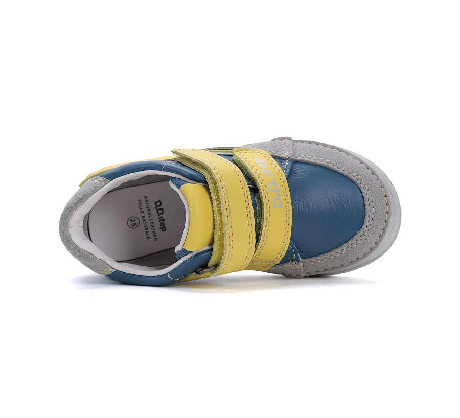 Átmeneti gyerekcipő kék-sárga színben, gumis orral. Valódi bőrből készült vízlepergető zárt cipő, amely nemcsak tartást ad a lábnak, hanem biztosítja a lábak természetes mozgását. Kényelmes és divatos modell a D.D.Step átmeneti gyerekcipő kollekciójából.