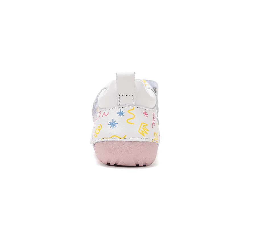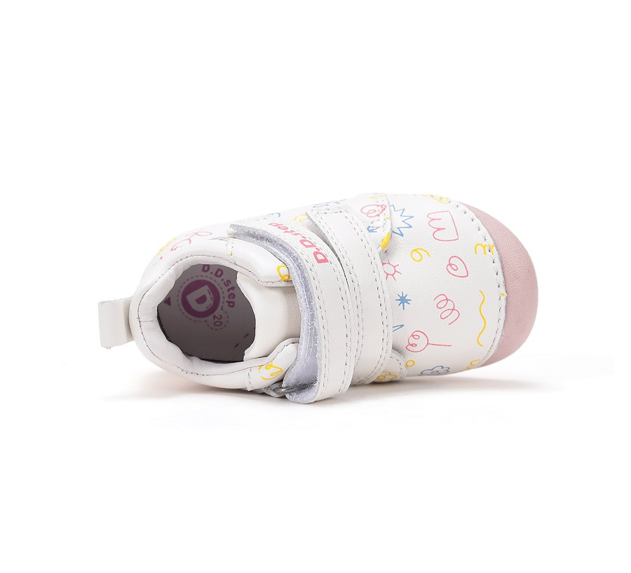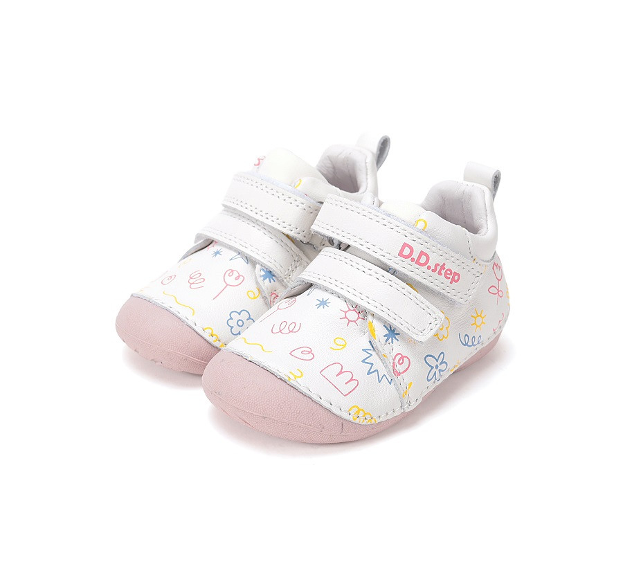 A kis lábakra illő fehér színű, mintás gyerekcipő az átmeneti hónapokra. Valódi bőrből készült vízlepergető cipellő, nemcsak tartja a lábakat, hanem biztosítja a lábikók természetes mozgását. Kényelmes és abszolút egészséges viselet.