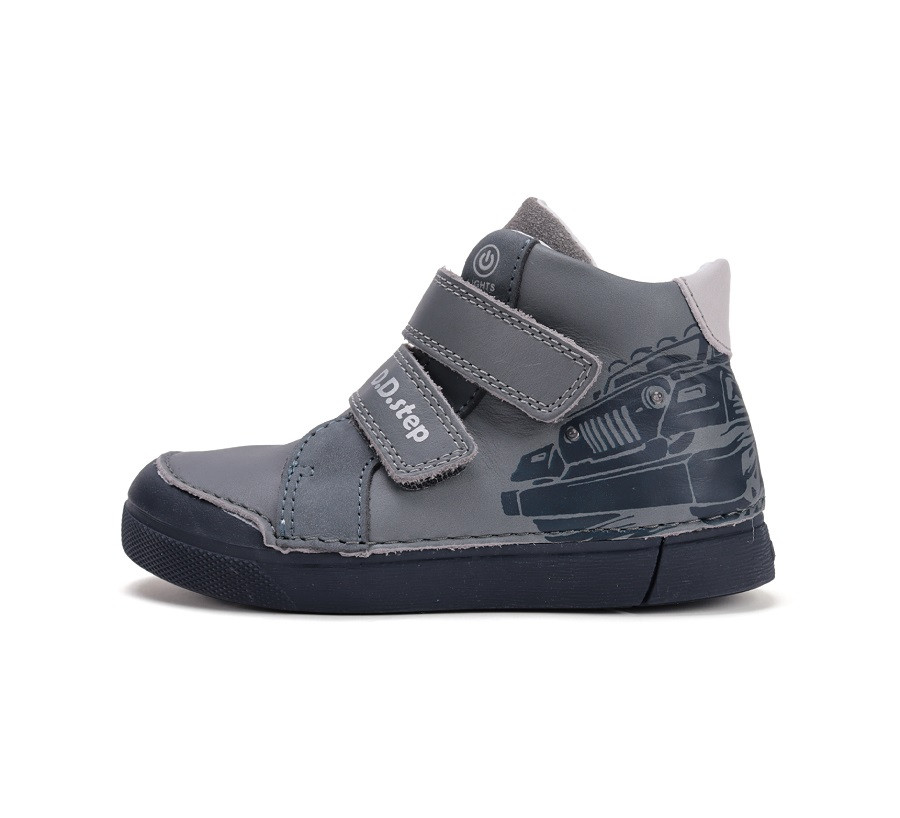 Magasszárú átmeneti gyerekcipő, led világítással, amely ennél a modellnél KIKAPCSOLHATÓ. A járás során a cipő oldalán található beépített LED diódák világítanak. Valódi bőrből készült vízlepergető zárt cipő, amely nemcsak tartást ad a lábnak, hanem biztosítja a lábak természetes mozgását. Kényelmes és divatos modell a D.D.Step átmeneti, világító gyerekcipő kollekciójából.