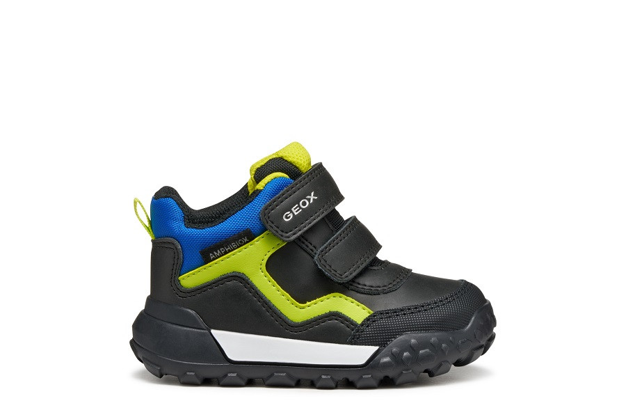 Vízálló gyerekcipő, amely hideg őszi időben, és enyhe téli időben is hordható.  A laminált nemez talpnak köszönhetően rendkívül jól ellenáll a hidegnek. A Geox Amphibiox vízálló cipő teljesen vízálló lábbeli, megakadályozza a cipőbe való víz bejutását és biztosítja a megfelelő szellőzést. A dupla tépőzárral  könnyű a fel-és levétel. A gyermek lábának tökéletes védelmet biztosít. Egyedülálló lélegző talppal.