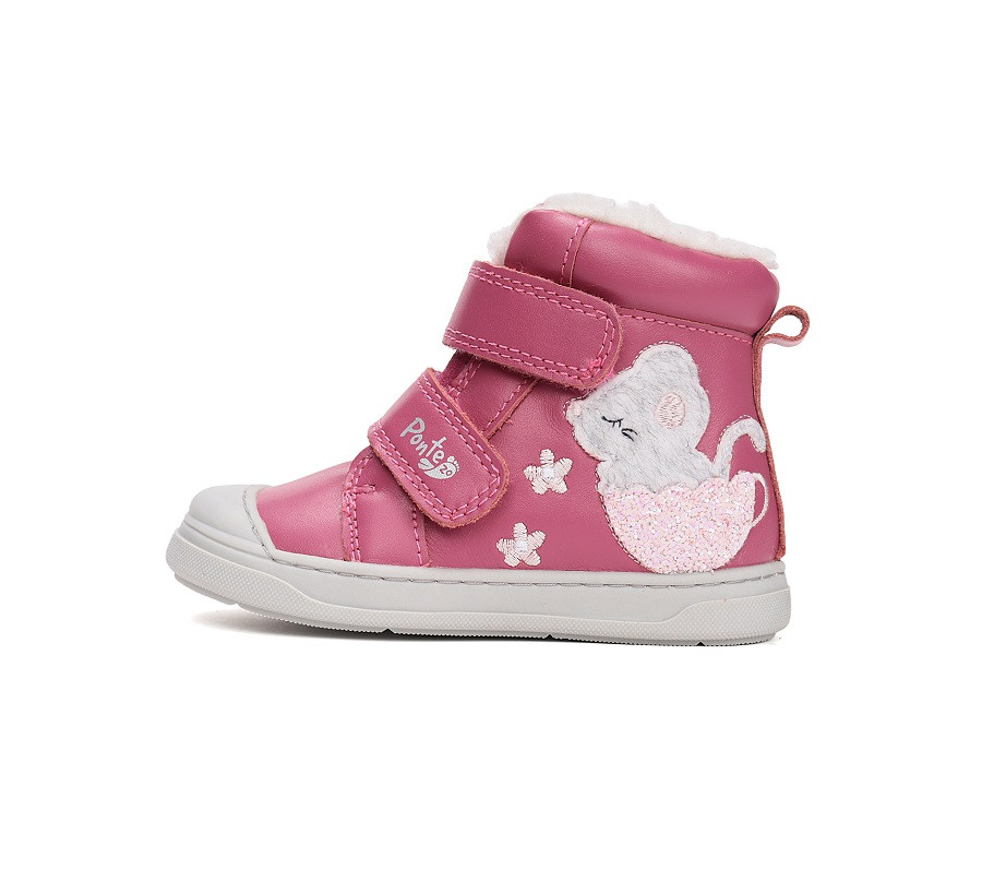 A Ponte20 márka egyik sikeres gumis orrú modellje bunda béléssel rózsaszínben, mintával az oldalán. Az izgő-mozgó kislányoknak egészséges és csinos viselet, valódi bőrből készült supinált zárt gyerekcipő. Praktikus gumis orr részével igazi strapabíró lábbeli. Tépőzáras kialakításának köszönhetően igazán könnyű a fel-és levétel.