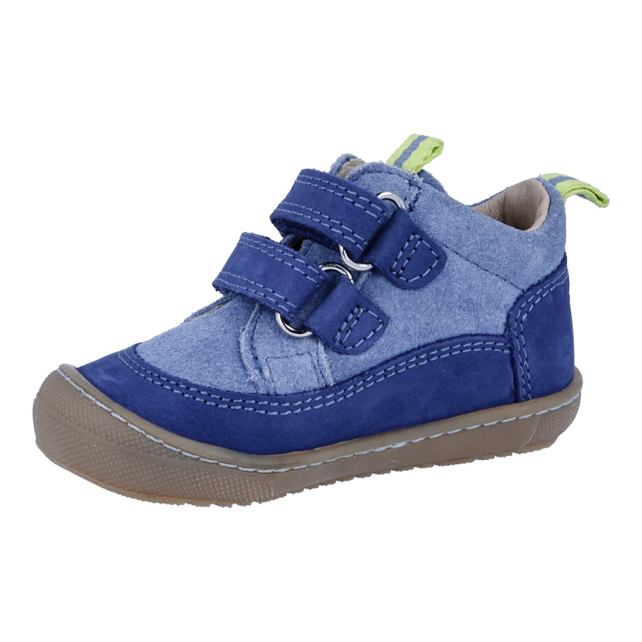 Egy tökéletes nubuk-,és velúrbőr átmeneti első lépés gyerekcipő kisfiúknak, elegáns kék színben. Gondosan védelmezi a lábikókat, stabil tartást ad, az első lépések megtételéhez tökéletes választás.  A kiscipő gumis orra védi a lábujjakat.