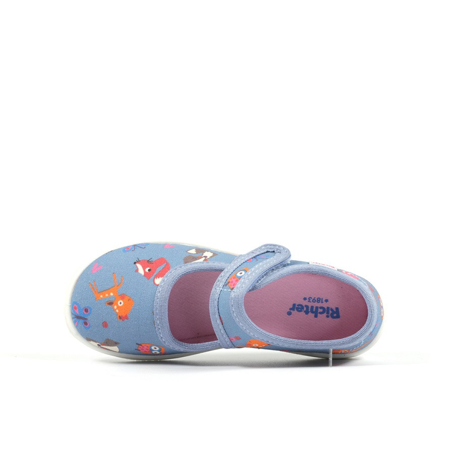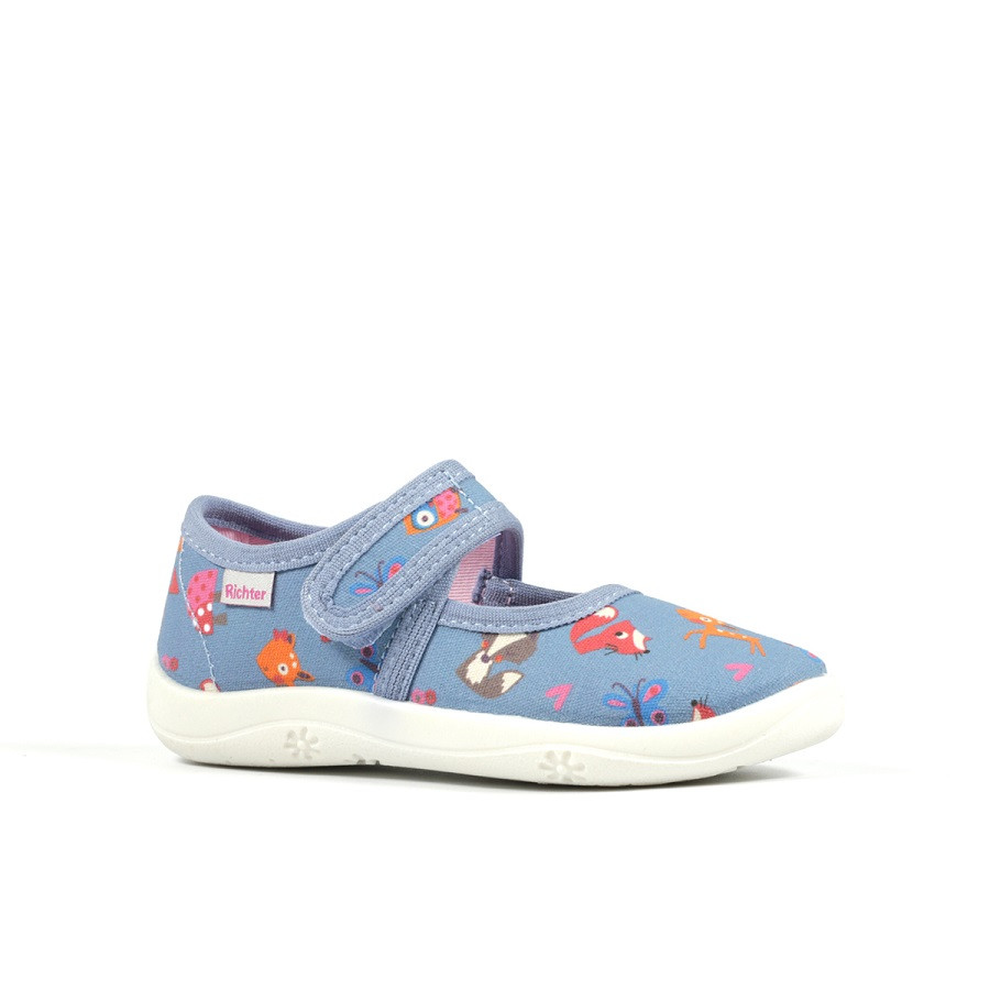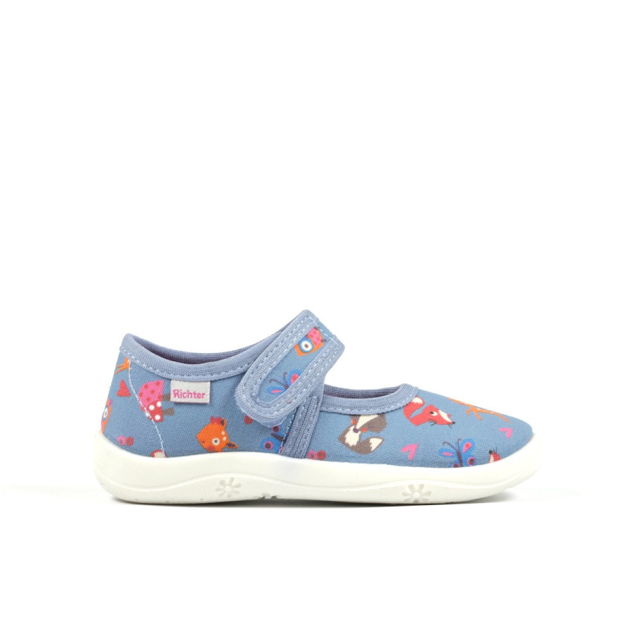 Richter világoskék, vászon balerina cipő, váltócipő, tornacipő mintás vászon anyagból. Óvodai váltcipőnek vagy nyáron utcai használatra  is használható. Anyaga kívül- belül lélegző pamut.